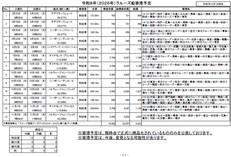 2026年秋田港への寄港について